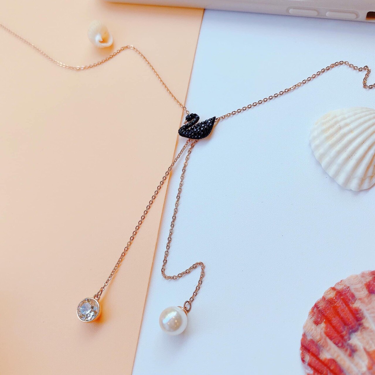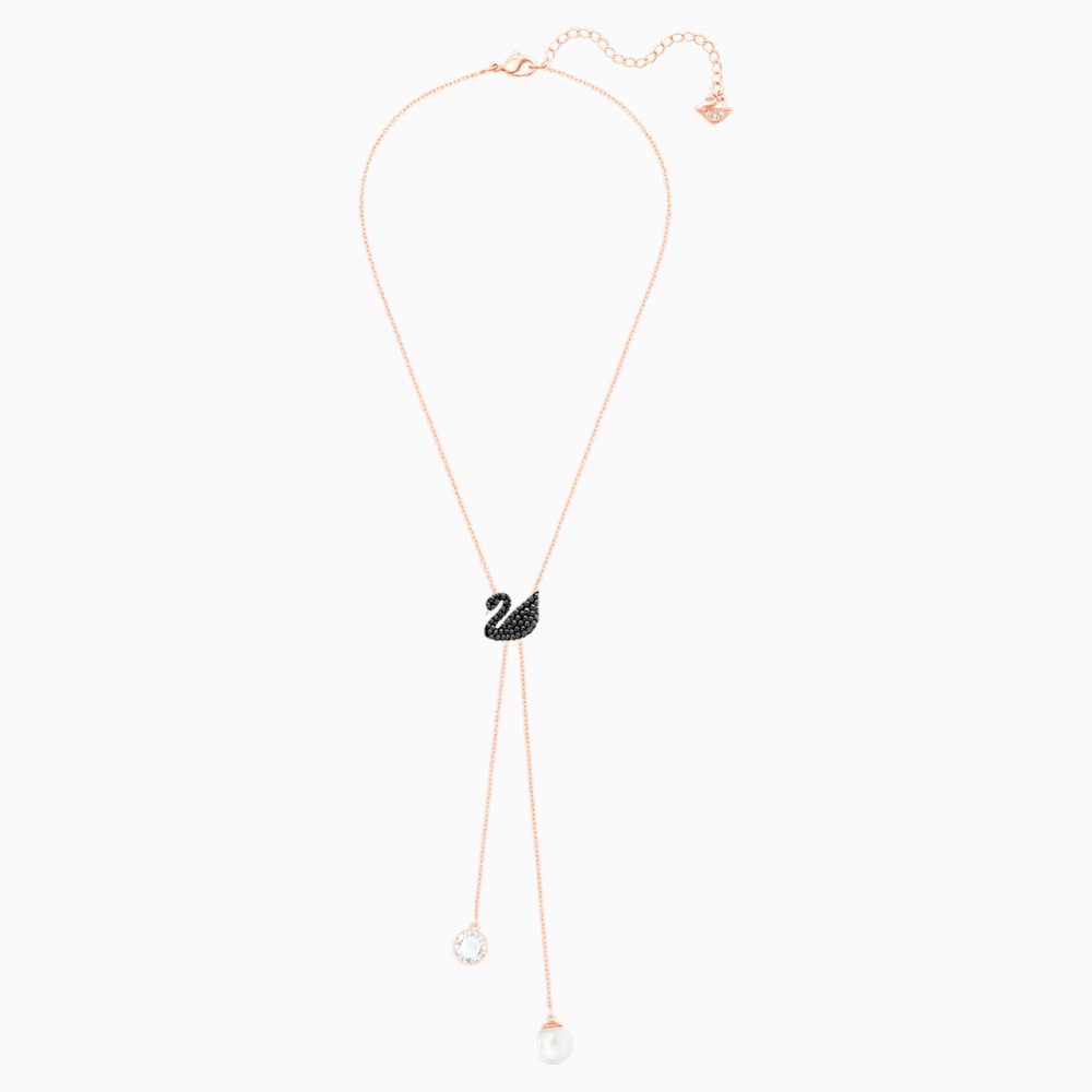 Dây chuyền thiên nga đen chữ Y Swarovski màu vàng hồng – Swarovski Iconic Swan Double Y Necklace, Black, Rose gold-tone plated
